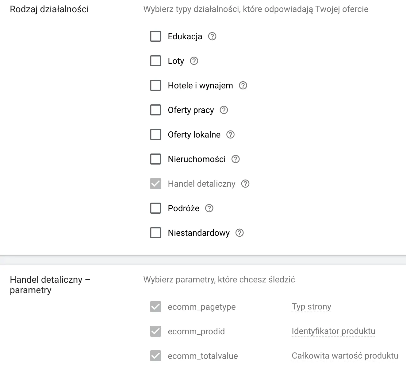 W kolejnym kroku wybierz rodzaj swojej działalności i parametry przesyłane do Google Ads. Jeżeli prowadzisz działalność e-commerce, powinno to wyglądać w następujący sposób:
