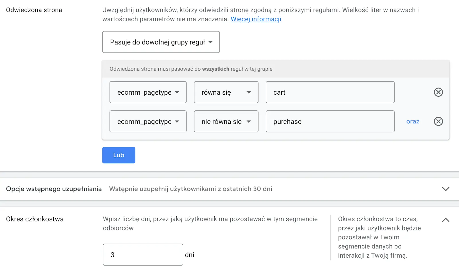 Kolejnym istotnym krokiem jest wybór opcji kierowania naszych reklam do konkretnych odbiorców. Rozwiń „Segmenty odbiorców” i dodaj stworzone wcześniej listy.