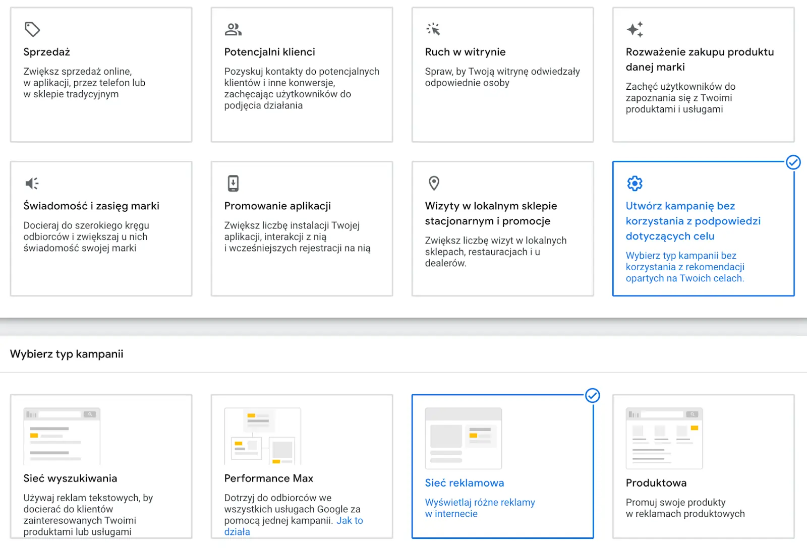 Wejdź na konto Google Ads, następnie wybierz niebieski plus i dodaj nową kampanię. Utwórz kampanię bez korzystania z podpowiedzi dotyczącej celu. W typie kampanii wybierz sieć reklamową: