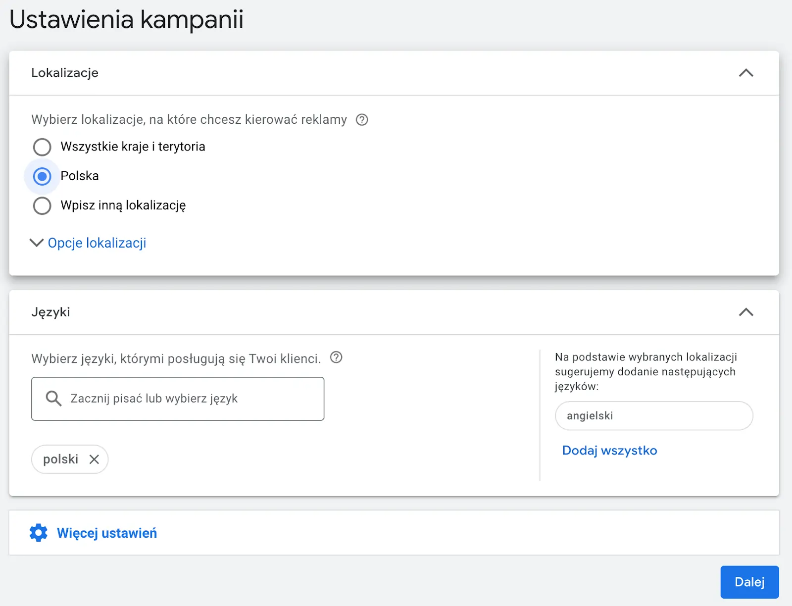 Wypełnij wszystkie dostępne pola z nazwą kampanii, lokalizacją, językiem i rozwiń „więcej ustawień”